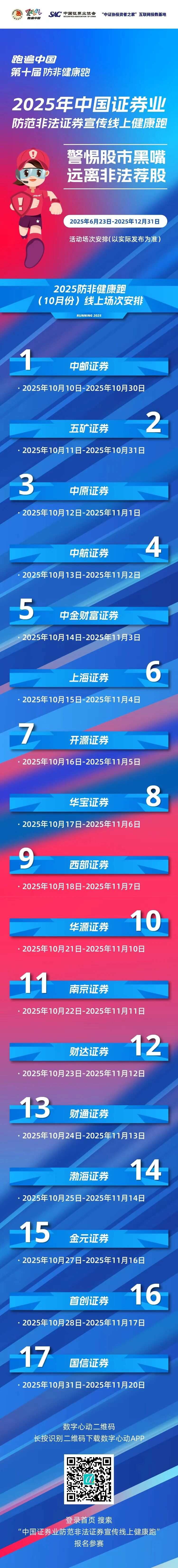 2025年10月,中邮证券、五矿证券、中原证券、中航证券、中金财富证券、上海证券、开源证券、华宝证券、西部证券、华源证券、南京证券、财达证券、财通证券、渤海证券、金元证券、首创证券、国信证券将组织举办17场防非宣传健康跑线上活动,欢迎广大投资者、证券从业人员关注并积极参与。