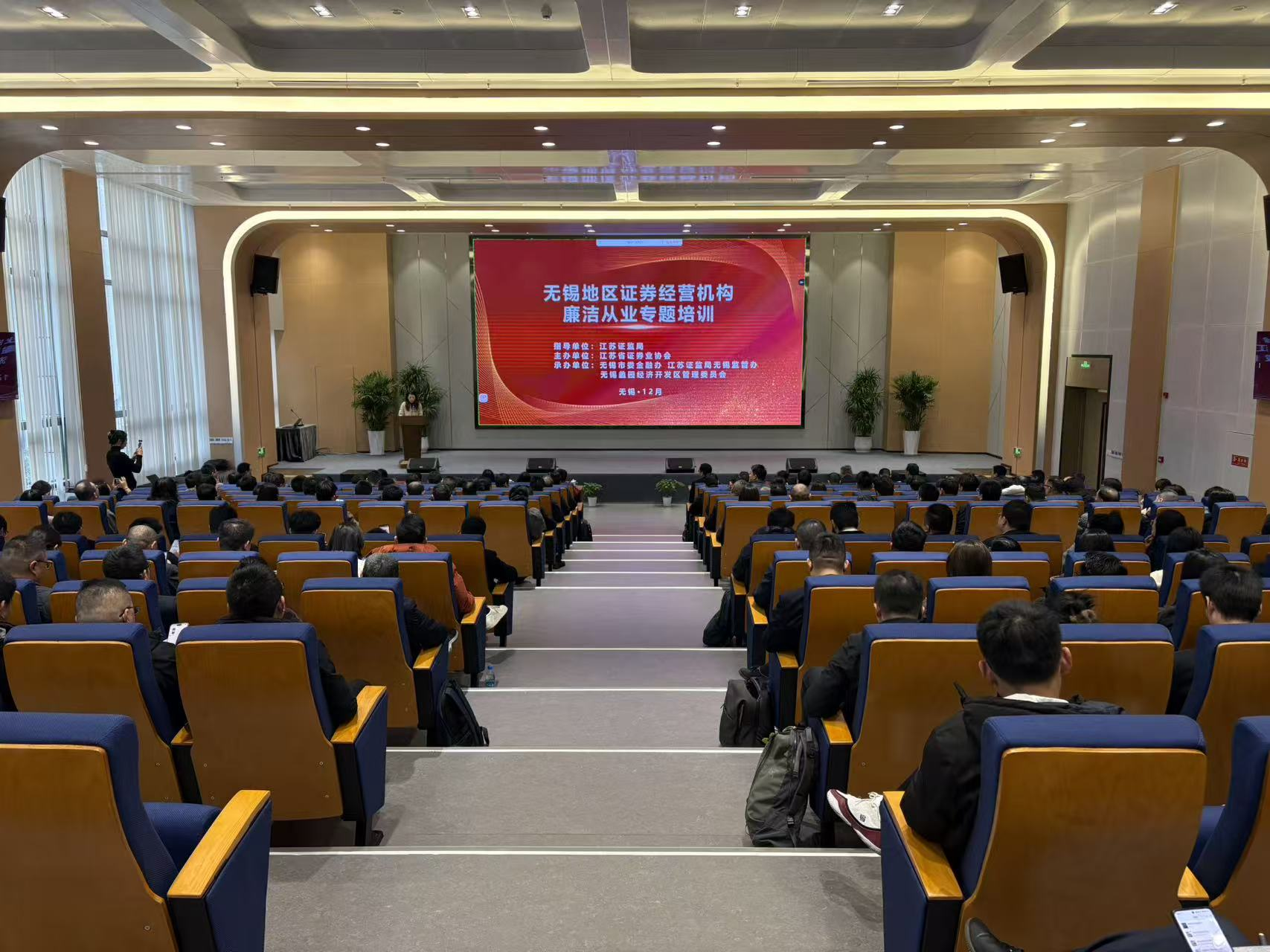 为进一步强化党建引领,增强证券从业人员廉洁从业意识,在江苏证监局的指导下,2025年12月23日,江苏省证券业协会联合无锡市委金融办共同举办无锡地区证券经营机构廉洁从业专题培训,本次培训特邀江苏省人民检察院第三检察部三级高级检察官王莉和江苏证监局稽查一处处长夏恬授课,无锡地区法人证券公司、证券分支机构负责人及党务工作者等近200人现场参训。