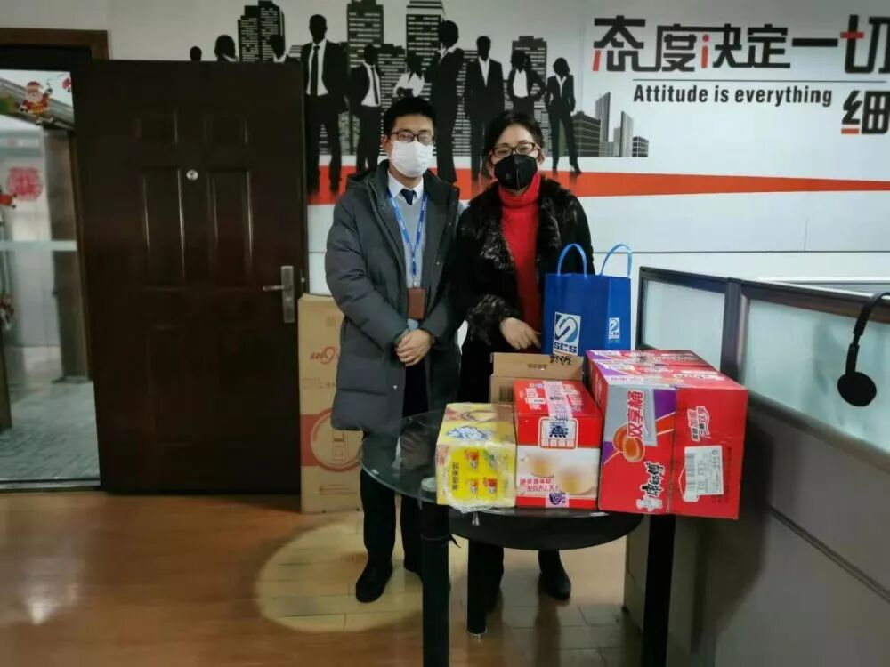 部门负责人崔檬和部门分管领导李天松第一时间将公司的口罩和慰问食品送到狮山路。