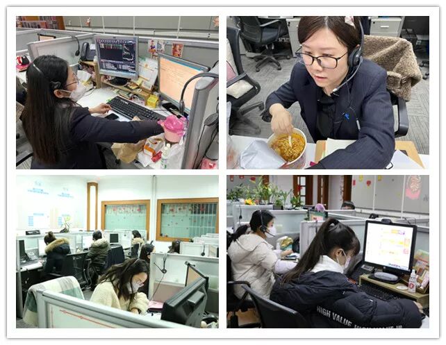 客服中心员工不间断接线,午餐只能抽空吃个汉堡或者泡面,全员在线,时刻在岗。
